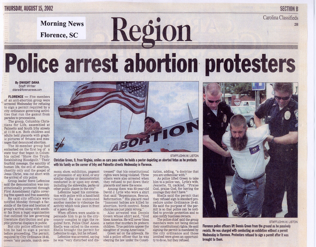 FLORENCE MORNING NEWS - August 14, 2002 - "Florence police arrest abortion protesters"