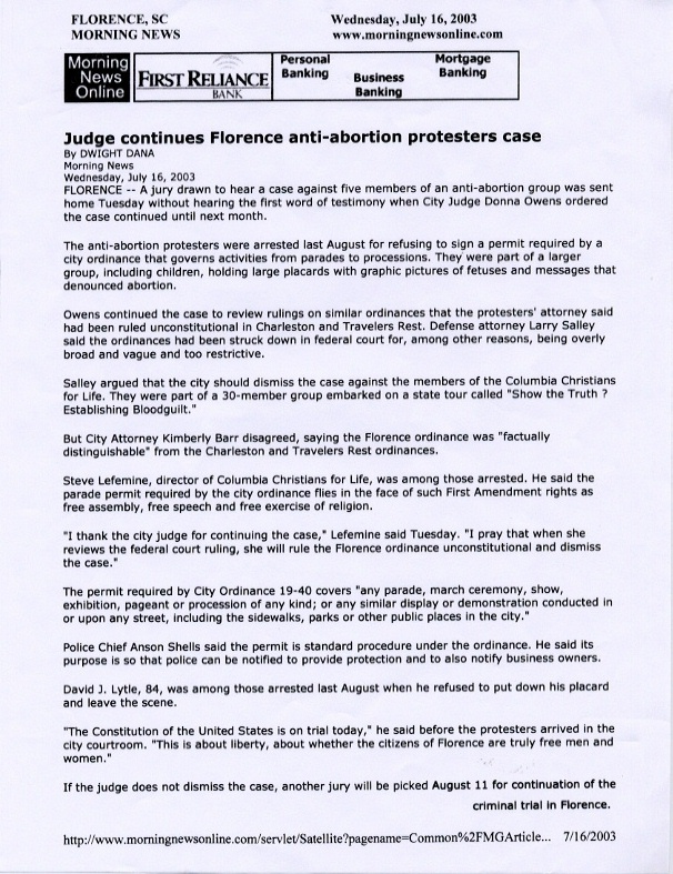 FLORENCE MORNING NEWS - July 16, 2003 - "Judge continues Florence anti-abortion protesters case"